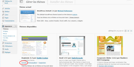 Un peu d’attente pour que le transfert se termine et rendez vous dans l’interface d’administration de wordpress. Votre nouveau thème devrait apparaître dans Apparence/thèmes et il suffit de l’activer.